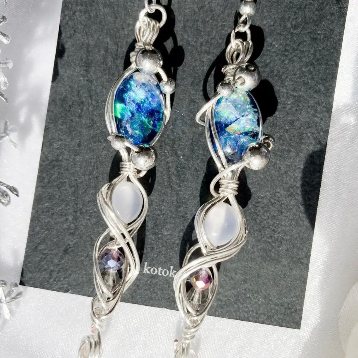 青い宝石のようなレジンをシルバーのワイヤーで