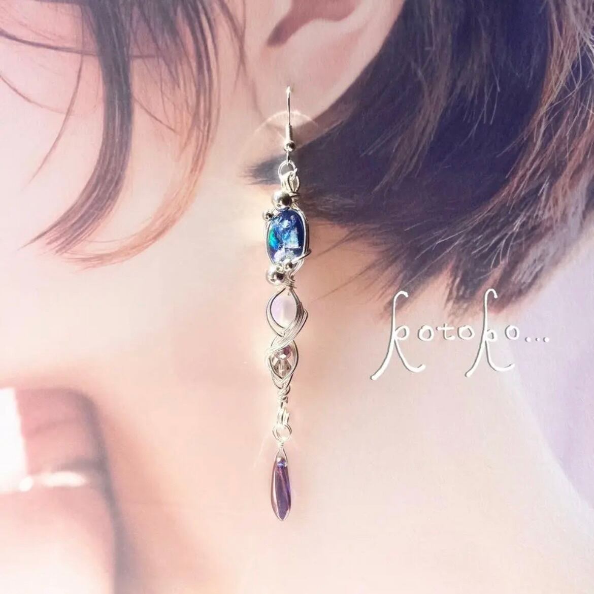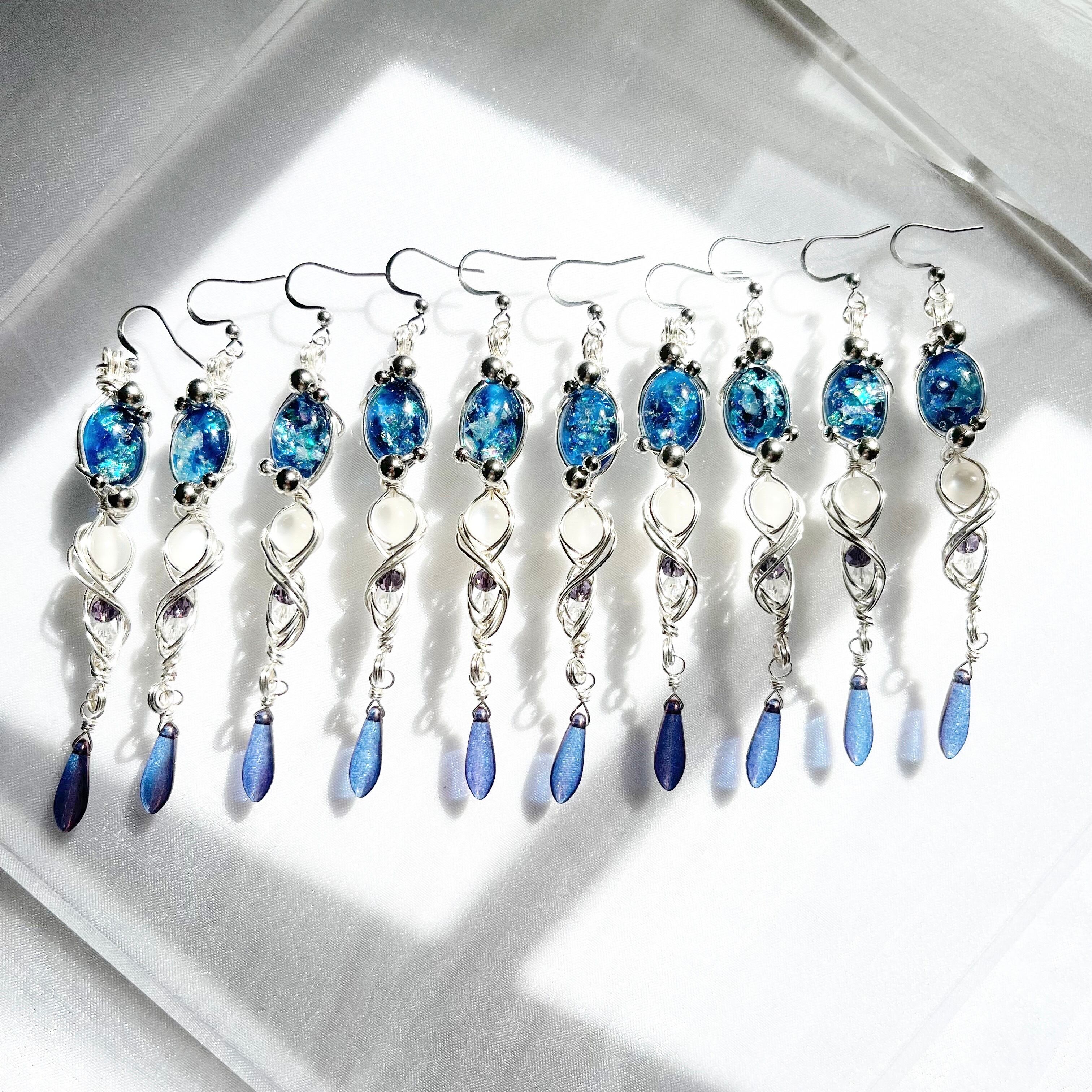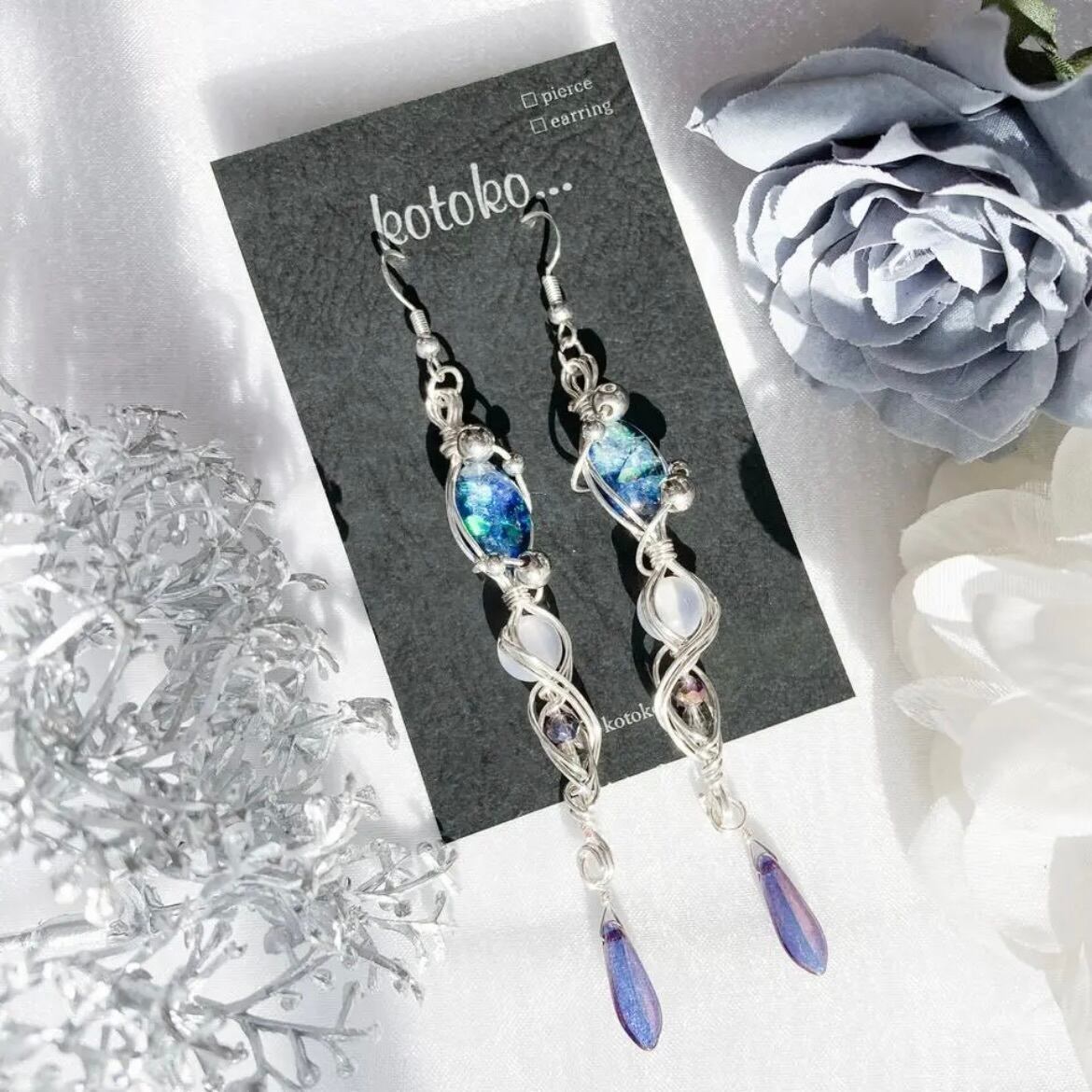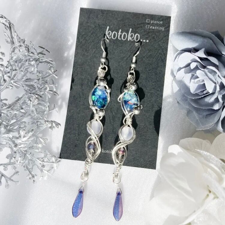 素材▶︎アーティスティックワイヤー(銅線にシルバーメッキ、更にポリウレタン加工)、ピアス金具(サージカルステンレス)、レジン(合成樹脂)、パール、ビーズ